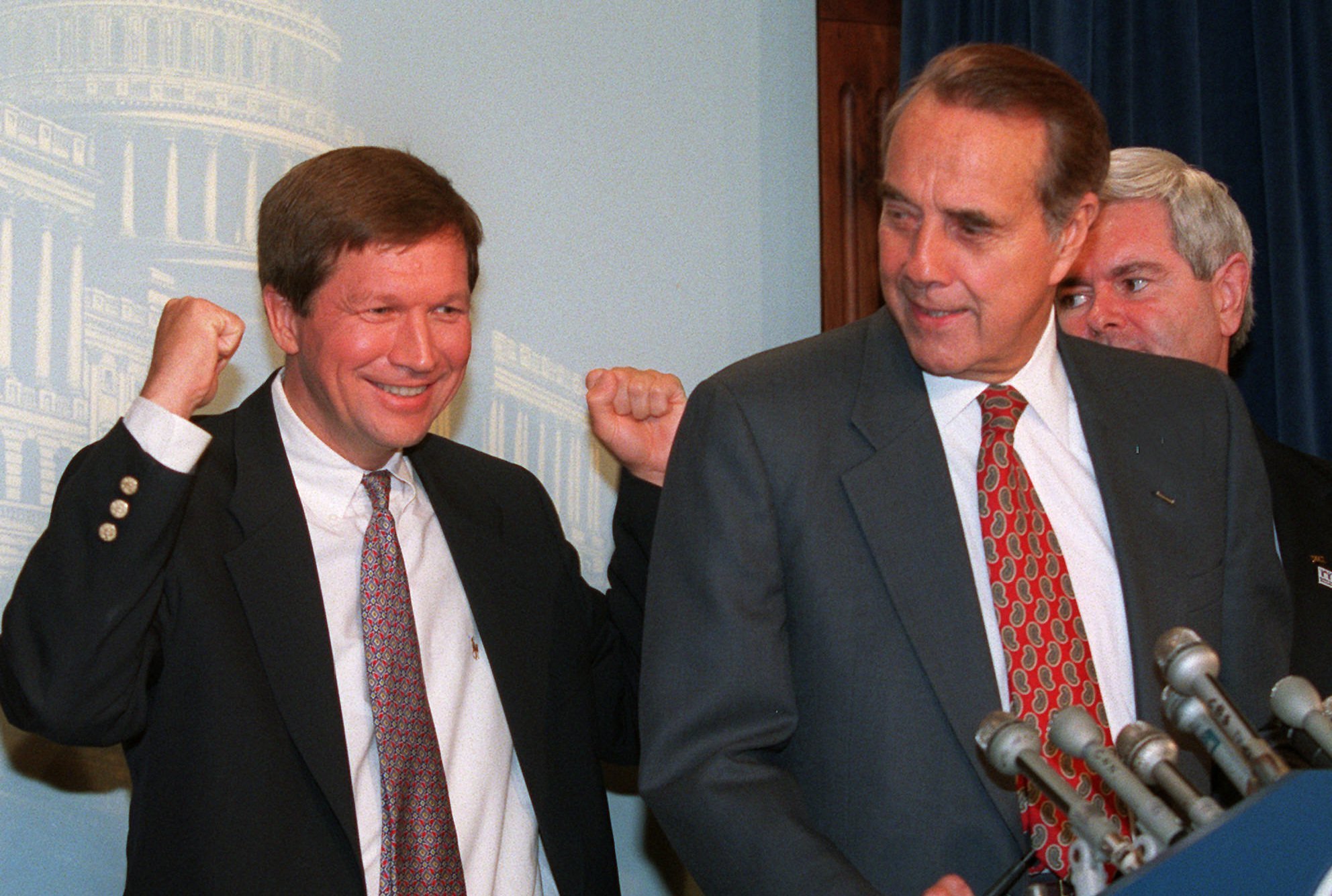John Kasich, left, chairman of the House Budget Committee, celebrates a compromise budget agreement with Senate Majority Leader Bob Dole and House Speaker Newt Gingrich in 1995. (Doug Mills/AP)