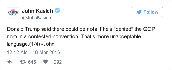 Ohio Gov. John Kasich stepped gingerly toward condemning rival candidate Donald Trump on Thursday. The comment that went too far for Kasich: the real estate mogul’s warning of “riots” later this summer if GOP officials move to deny him the nomination.