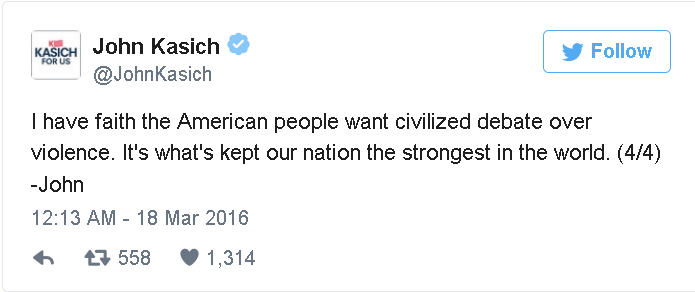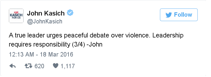 Kasich has attempted to draw a contrast between himself and his mud-slinging rivals by giving his candidacy a sunny, positive tone. While taking issue with the Trump campaign’s “toxic atmosphere,” he has largely refrained from criticizing Trump the man. Kasich has dodged questions over Trump’s fitness for the presidency in TV interviews and has stuck by his pledge to support the eventual GOP nominee even if that person is Trump.