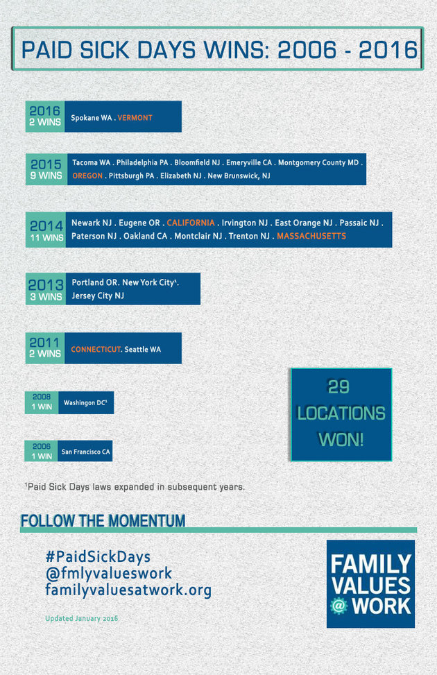 The progress in Democratic presidential candidate Bernie Sanders' home state is just the latest sign that the momentum toward a national paid sick leave law is growing quickly. Since 2006, four states (California, Connecticut, Massachusetts and Oregon) and 24 municipalities have introduced the benefit. And more are considering it, including Maryland, Chicago, Michigan and Minneapolis.