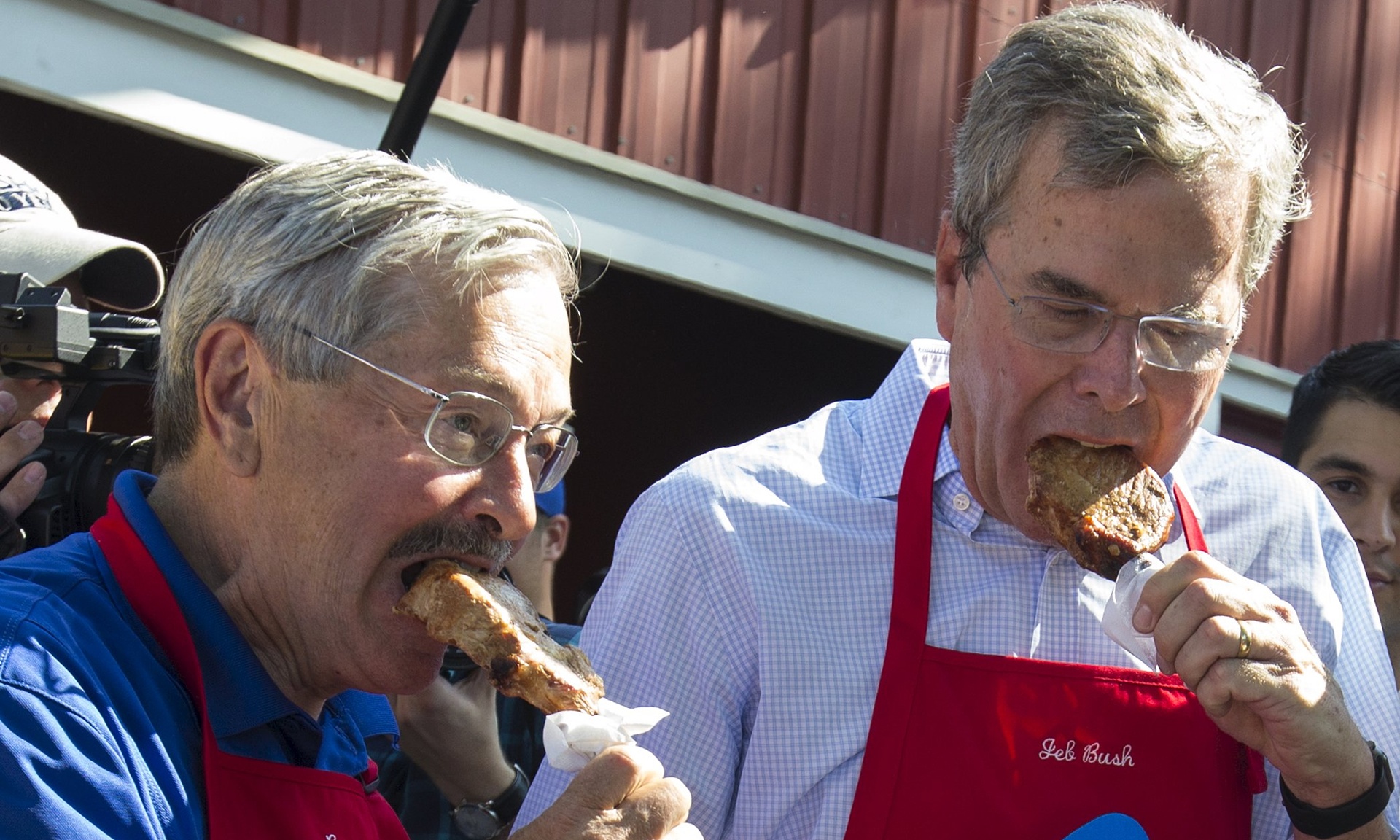 Bush eats a pork chop on a stick with Iowa governor Terry Branstad. Photograph: Jim Young/Reuters