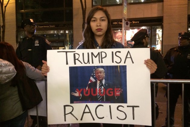 "I don't think he should be leading in the polls because that's a message of hatred America is sending to the rest of the world, which is watching our elections right now," added Gabriela Bermudez, 21, who was at the protest with New York University's Dream Team, a pro-immigration group at the school.