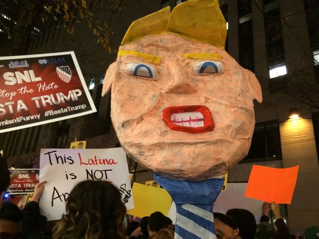 NEW YORK -- As Donald Trump prepared for his big "Saturday Night Live" appearance, Latino activists and supporters gathered outside the NBC studios and protested the network's decision to feature a man who has called Mexican immigrants "rapists."