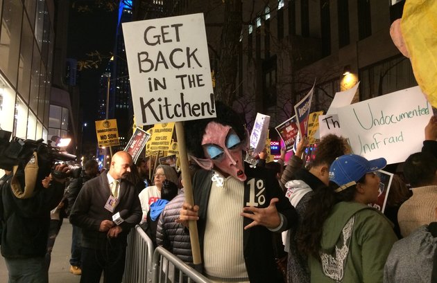 The group of anti-Trump protesters started out at Trump Tower in Midtown Manhattan and marched down Fifth Avenue to Rockefeller Center. Along the way, they passed the expensive stores lining the famous street, with shoppers stopping to gawk and take pictures with their cellphones. People cleared the sidewalks for them, and some cab drivers honked and yelled in support along the way.