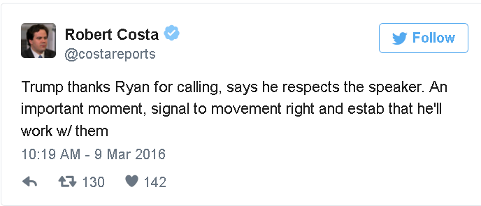 But Trump is also shrewd. He knows that the GOP establishment is organizing to stop him, by keeping him from getting 50 percent of the delegates and then using a convention vote to nominate somebody else. And Trump knows that the establishment could succeed, even though it’d almost certainly make Hillary Clinton president. One way for Trump to pacify the opposition is by showing that he cares about a Republican majority -- and praising the Republican lawmaker most responsible for defining the party’s policy agenda.