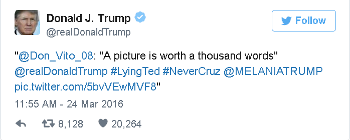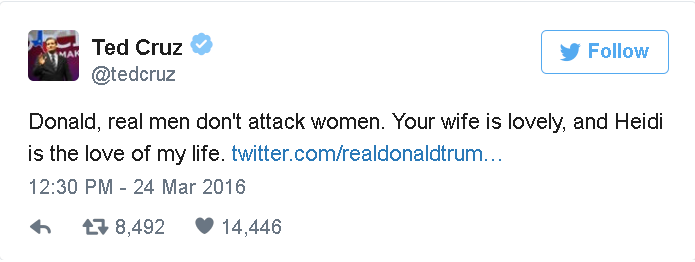 On Wednesday night, Donald Trump and Ted Cruz got into a Twitter spat. After a conservative anti-Trump SuperPAC ran a gross, slut-shaming ad which used a half-naked photograph of Trump’s wife Melania, Trump threatened to “spill the beans” on Cruz’s wife, Heidi, presumably because he thought Cruz was behind the ad. (The SuperPAC is not affiliated with the Cruz campaign, though it is backing Cruz against Trump.)
