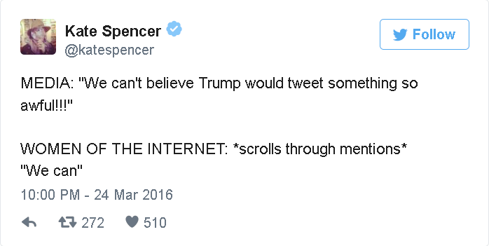 According to Trump, Rosie O’Donnell has a “fat, ugly face.” Bette Middler has an “ugly face and body.” Hillary Clinton couldn’t keep her husband “satisfied.” Megyn Kelly is a “bimbo” who objectifies herself because she once posed for GQ. Carly Fiorina could never win an election, because of her face. And now, as his Twitter feed implies, all America needs to know about Heidi Cruz and Melania Trump is that one of them is younger and hotter according to some men on Twitter.