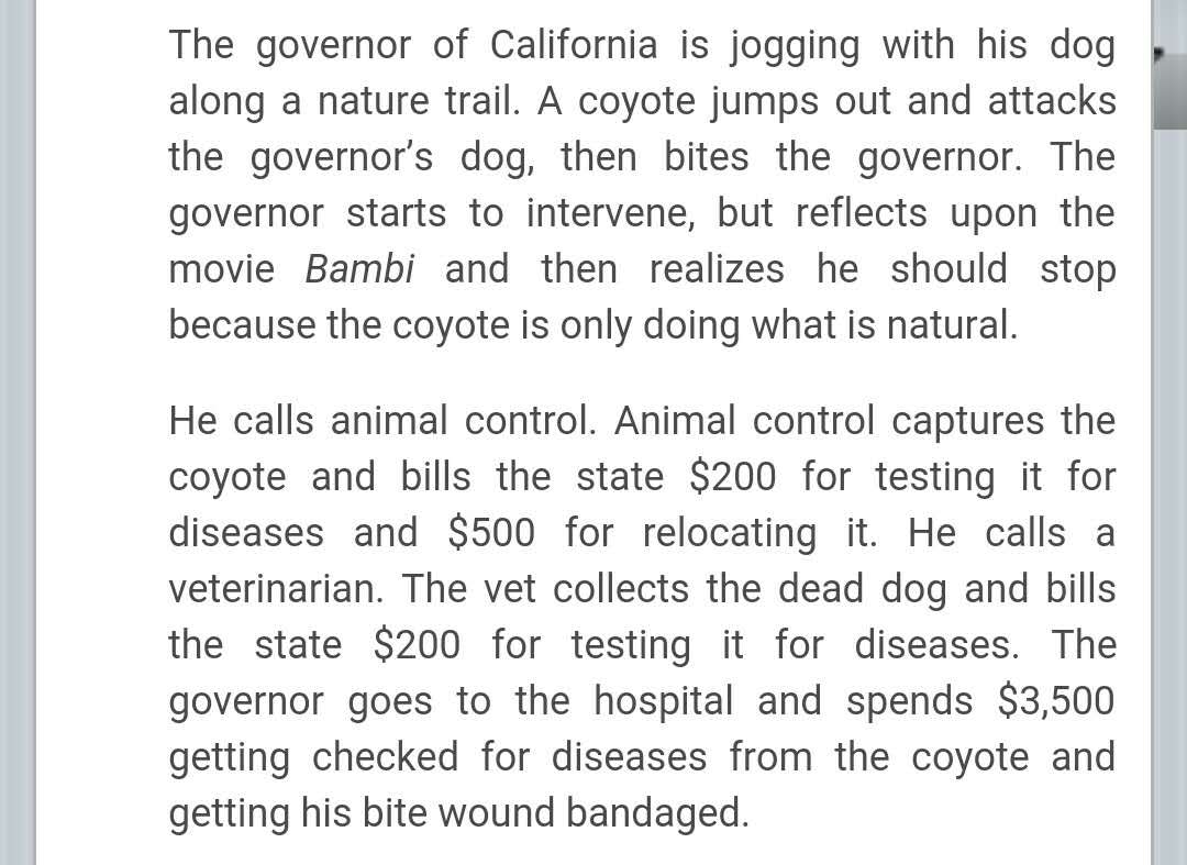• 我觉得这个joke的亮点在于,加州做了那么多功夫,最后还是被动物保护组织告了。大家比着走极端,为一些形而上的东西内耗,消耗了加州大量资源。