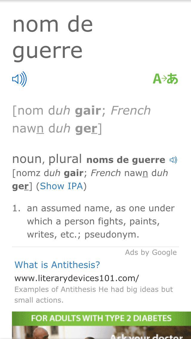 • @Lantong There are lots of French in English. Many have became part of English. You will see "nom de guerre" in mainstream English newspapers. Many terrorists are known by their nom de guerre, not their real or legal name. 双枪老太婆 is a nom de guerre.